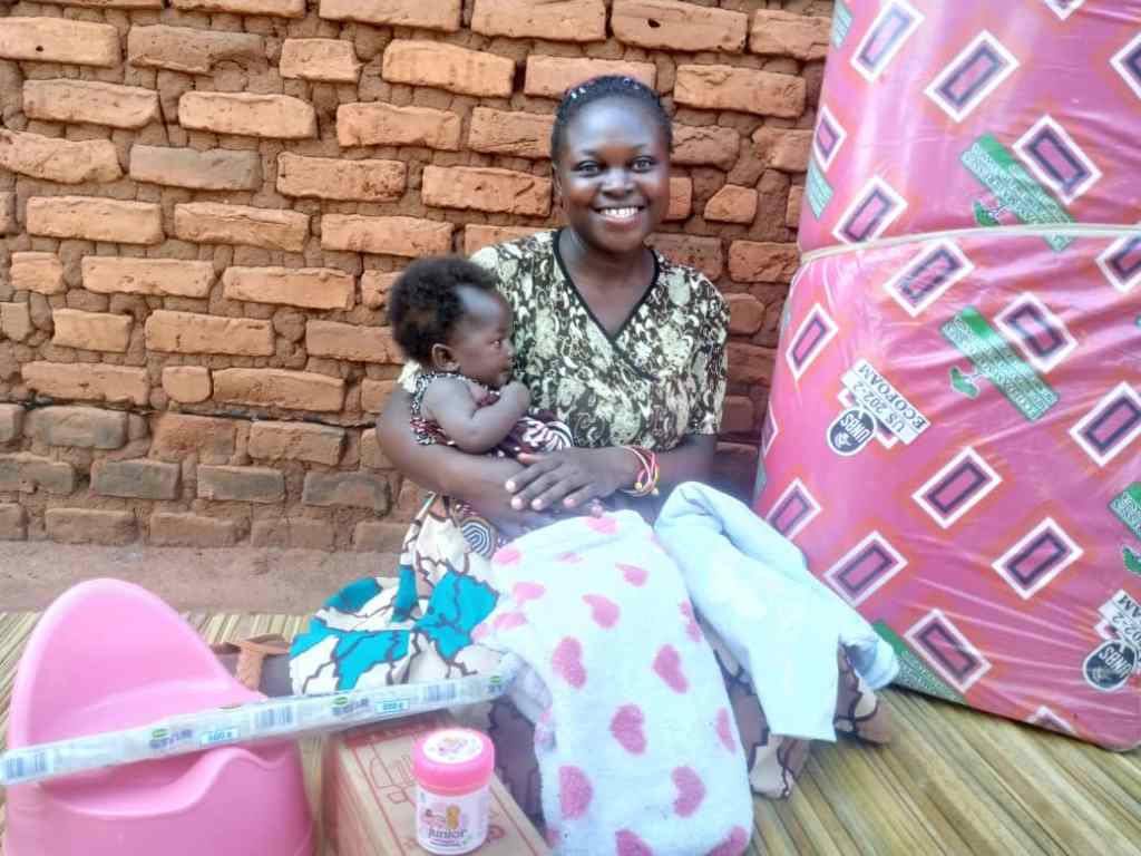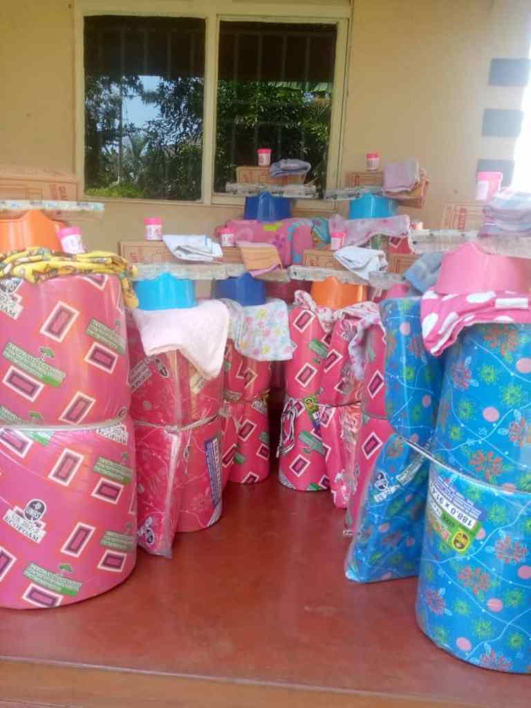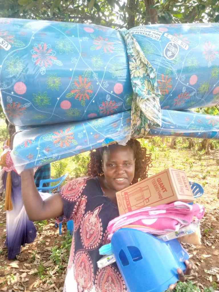 Dolgelukkig met een matras om op te slapen voor moeder en kind, zoals een van de moeders zei: een droom die uitgekomen is. Alle benodigdheden voor het bed zitten erbij, lakens, dekens en opnieuw cream voor de baby plus huishoudzeep en een thermosfles. Wat een feestelijke dag!!