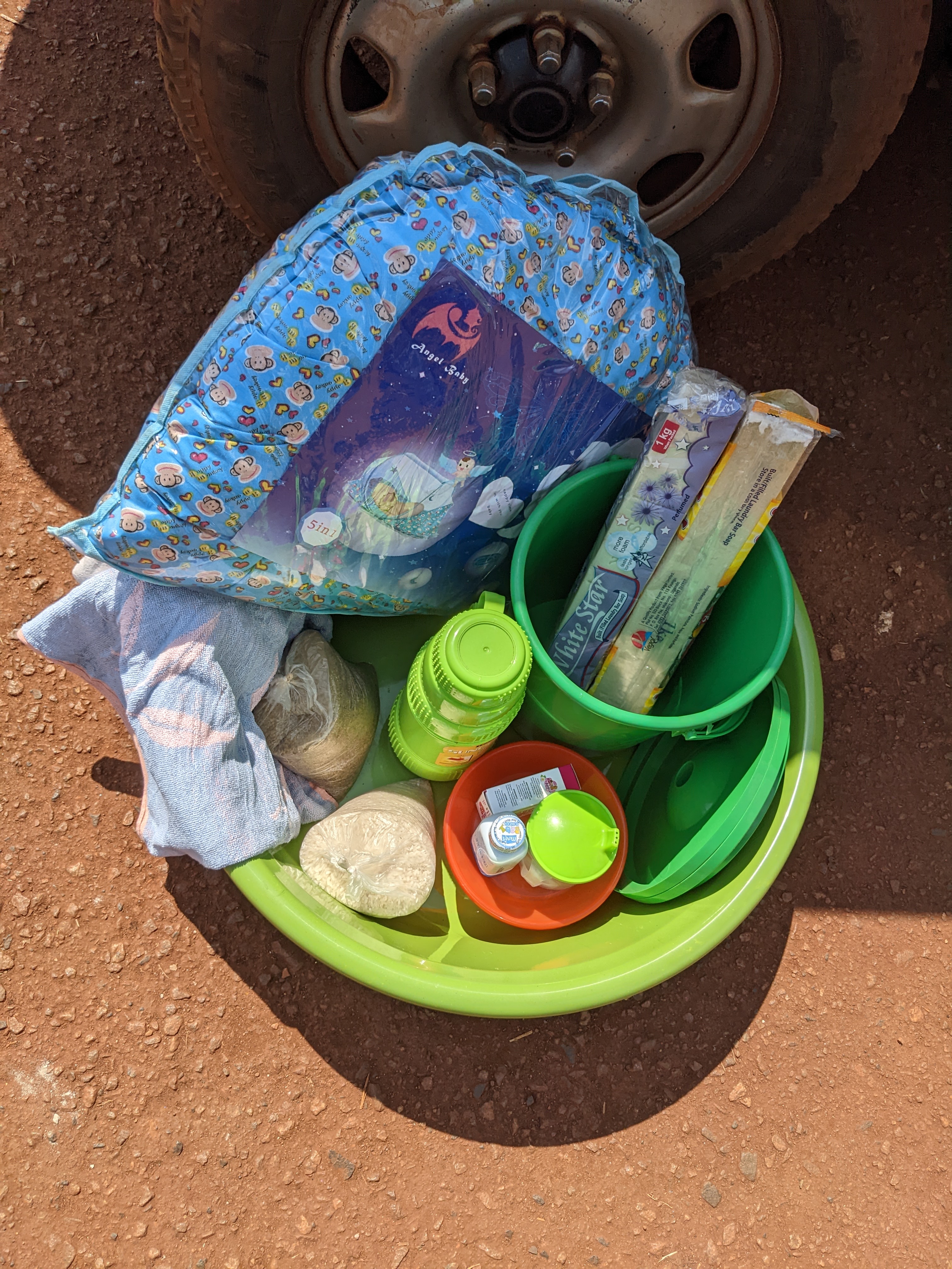 Wanneer we het ondersteuningspakket benodigdheden aan haar willen overhandigen zegt ze: nee dat kan ik niet betalen, ik heb geen geld.