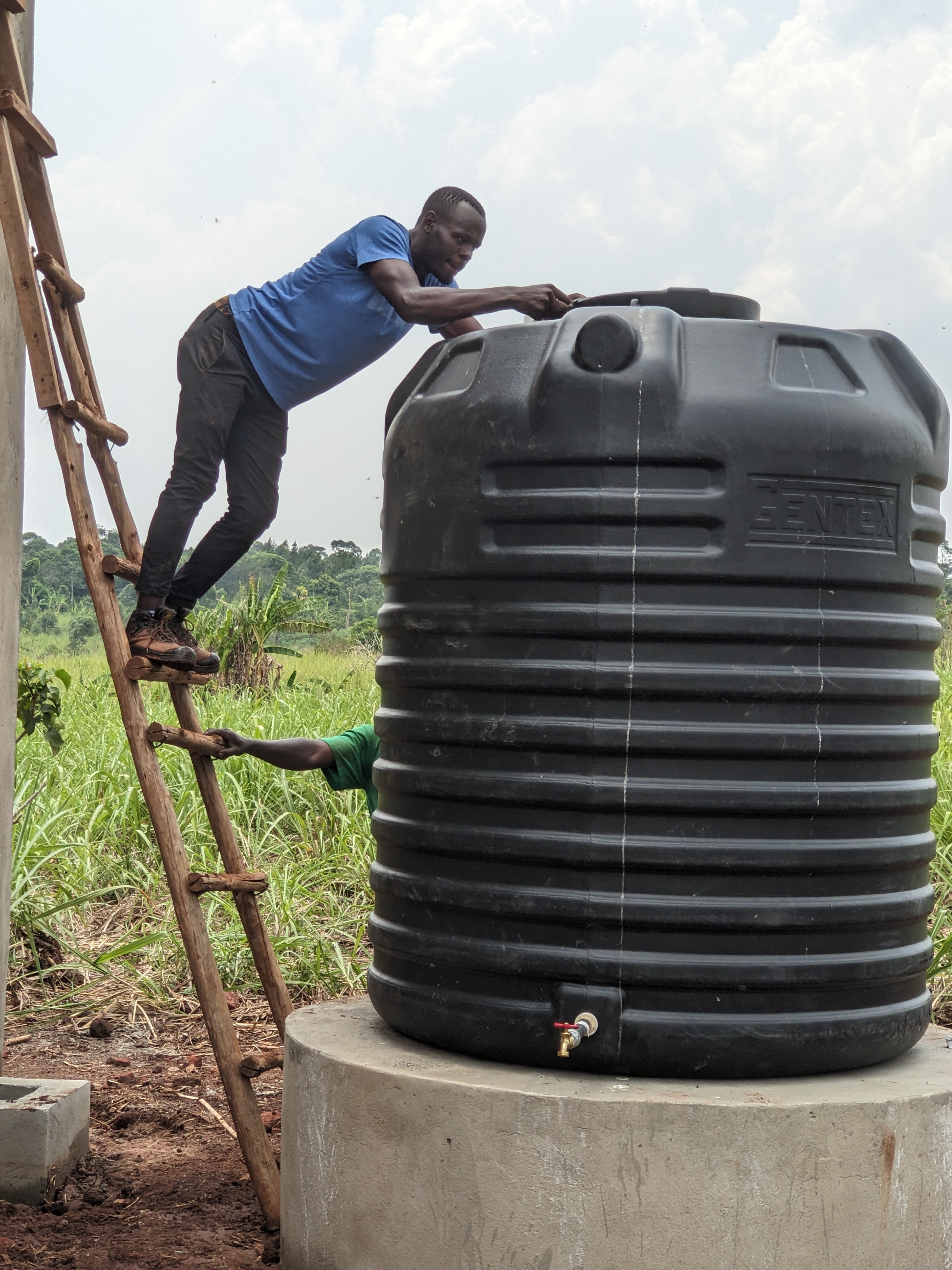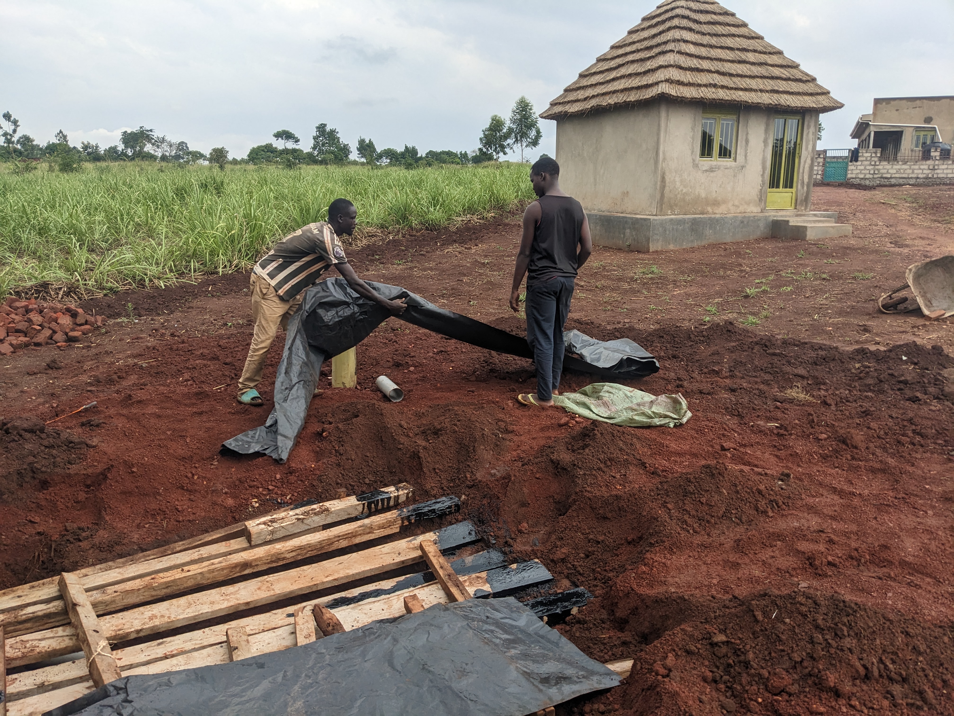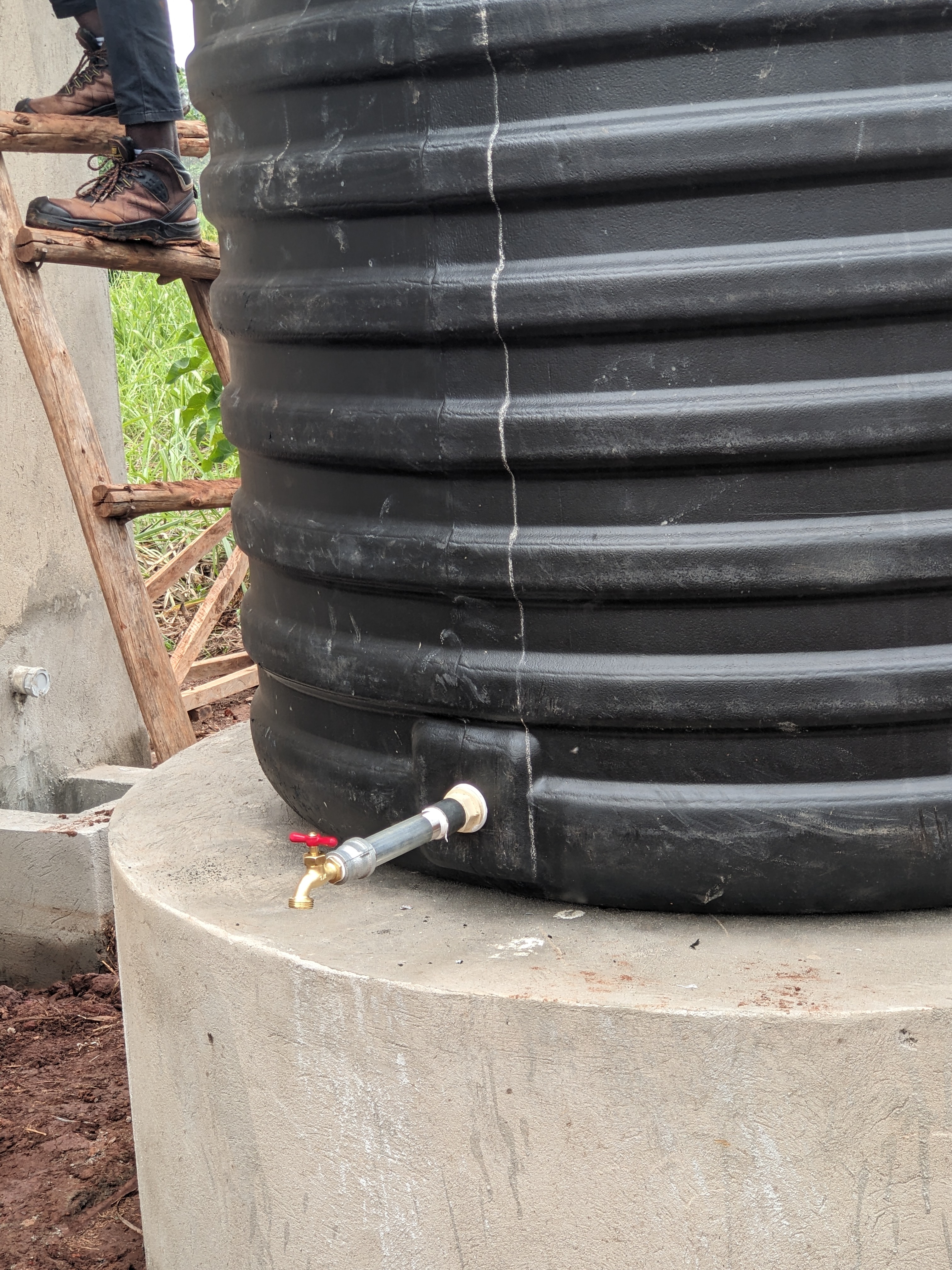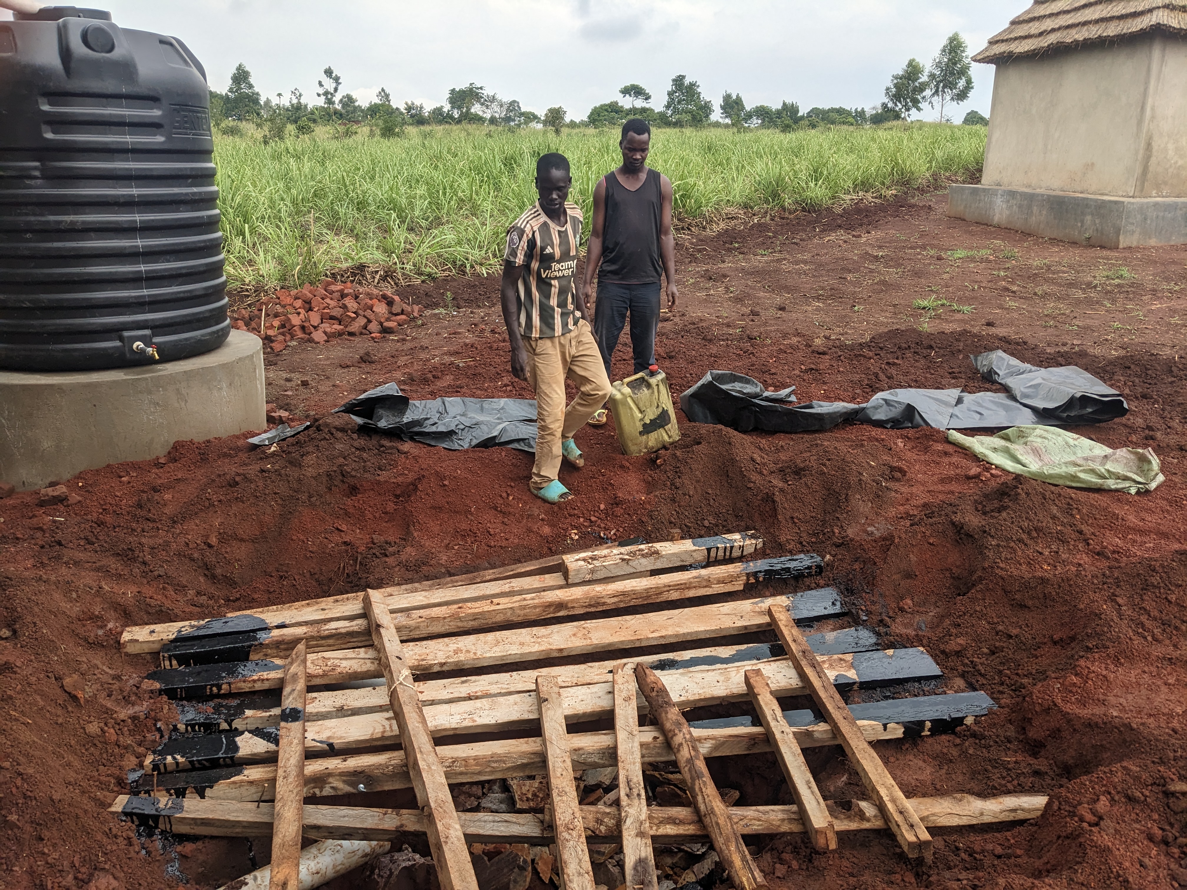 Begin maart: De watertanks zijn geplaatst en een kraan is erop aangesloten. Voor de waterafvoer is een put gegraven die hier weer afgedekt wordt.